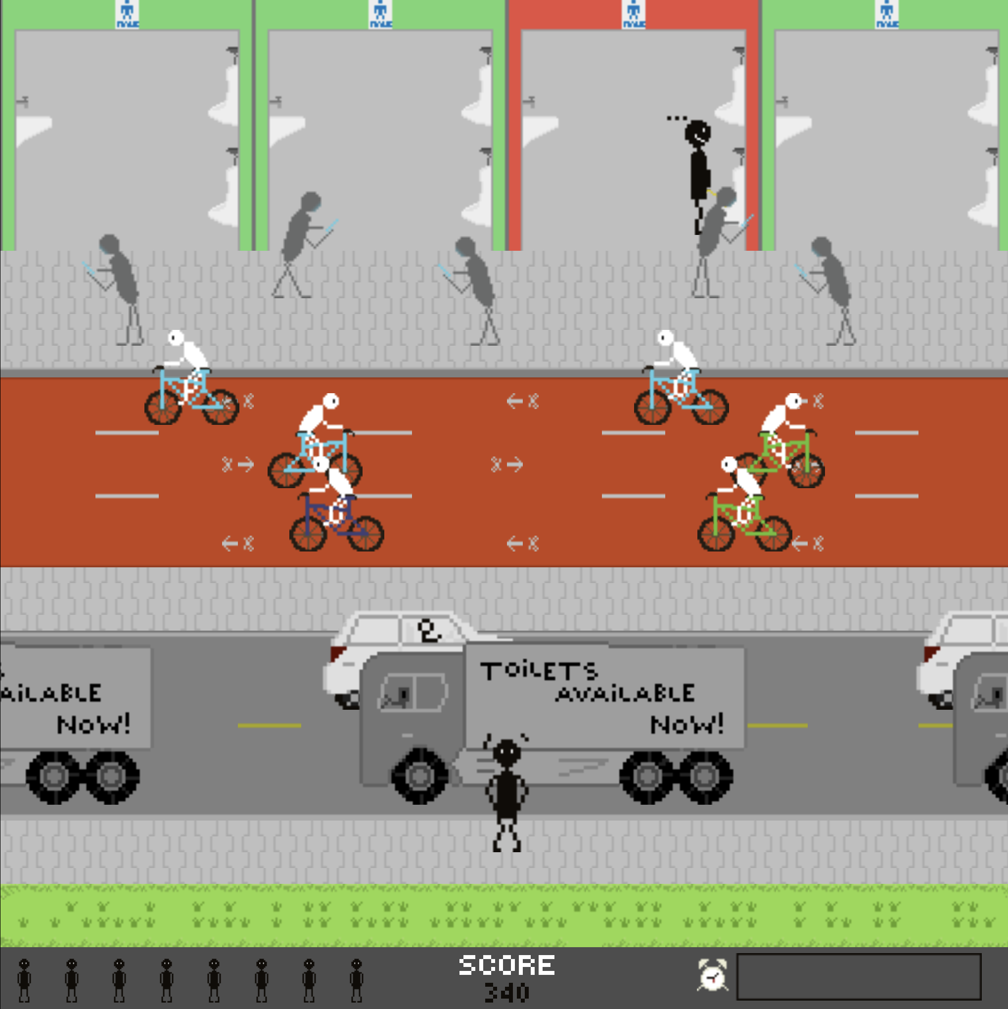 The game is a Frogger clone, but with a twist. You play as a man who really needs to pee, but the urinals are on the other side. You must jump between cars, eager bikers and last but far from least, pedestrians who are just glued to their phones.