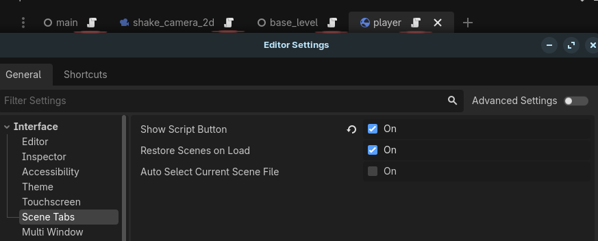 Toggling this feature on displays a script button next to the title of a scene's tab. Pressing this button immediately opens up the script of said scene. This is useful as the project increasingly has more scripts, and more tabs, and more everything open on the screen.