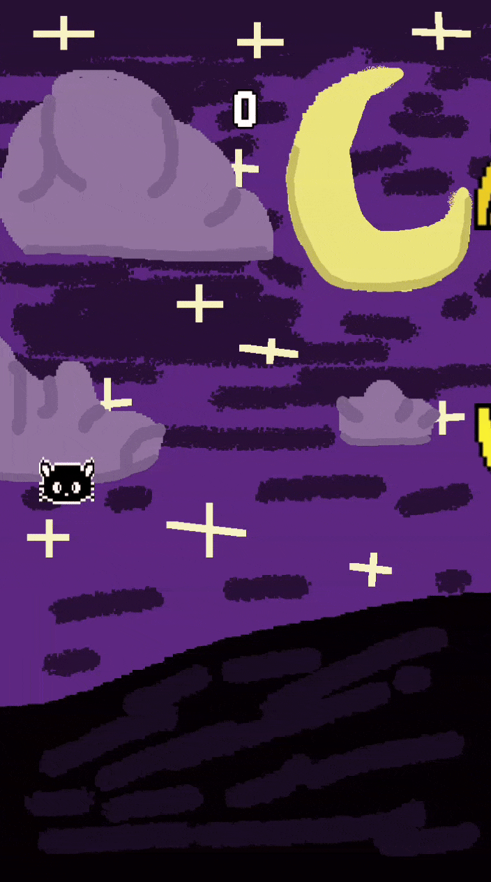 Tricat is the first game of the challenge. A Flappy Bird clone, with a small twist on the theme. In this case it being a black cat that has to avoid brooms with a purple and starry background representing the night. The player has to jump using their mouse button or space to keep the the cat afloat and avoiding the brooms.